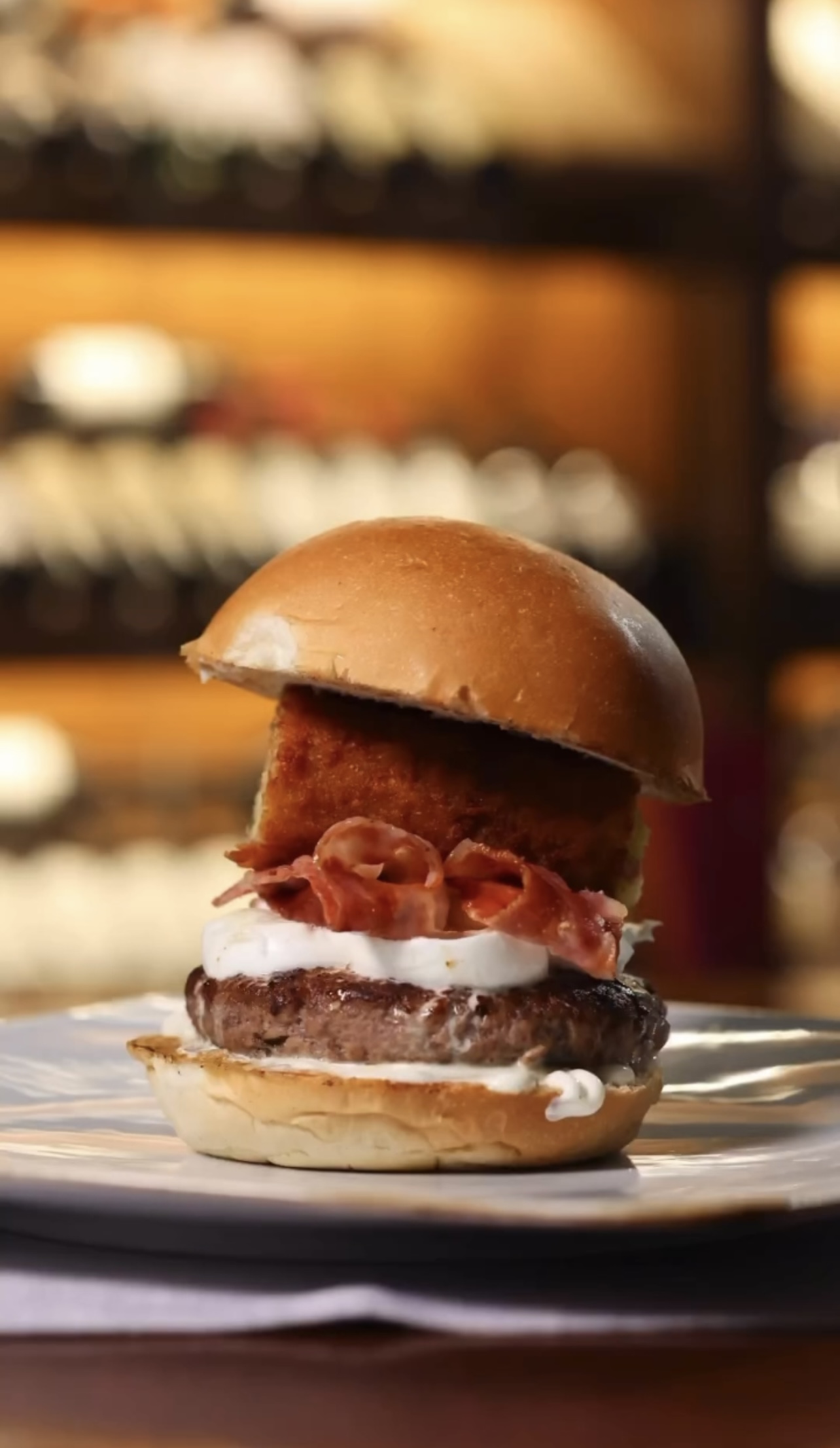 Hamburger di scottona, bacon, crocchè, mozzarella e maionese.