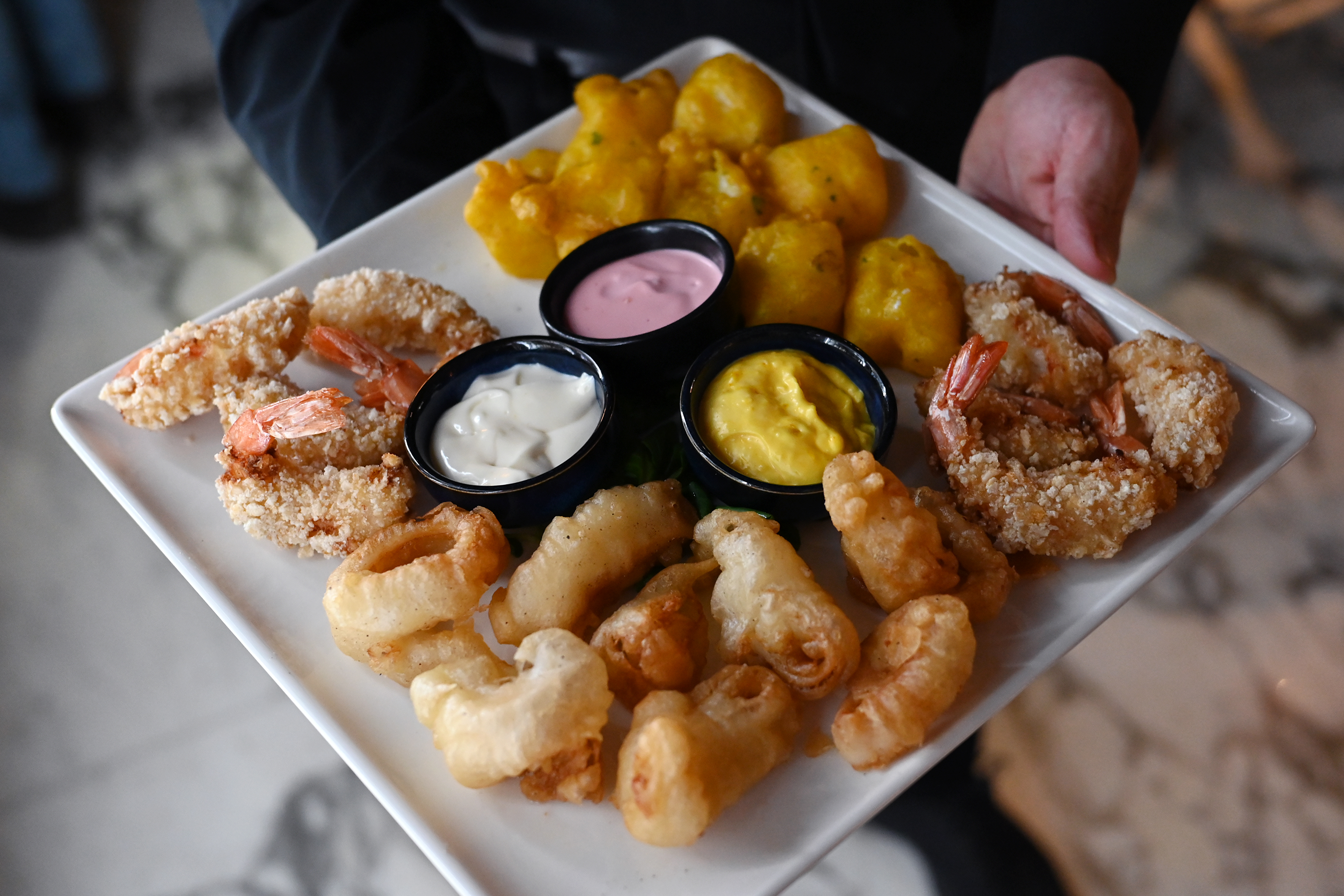 La nostra frittura mista comprende: gamberi al panko, cozze fritte, baccalĂ pastellato, calamari in tempura e polpettine di alici, con maionese alla cipolla e maionese agli agrumi.