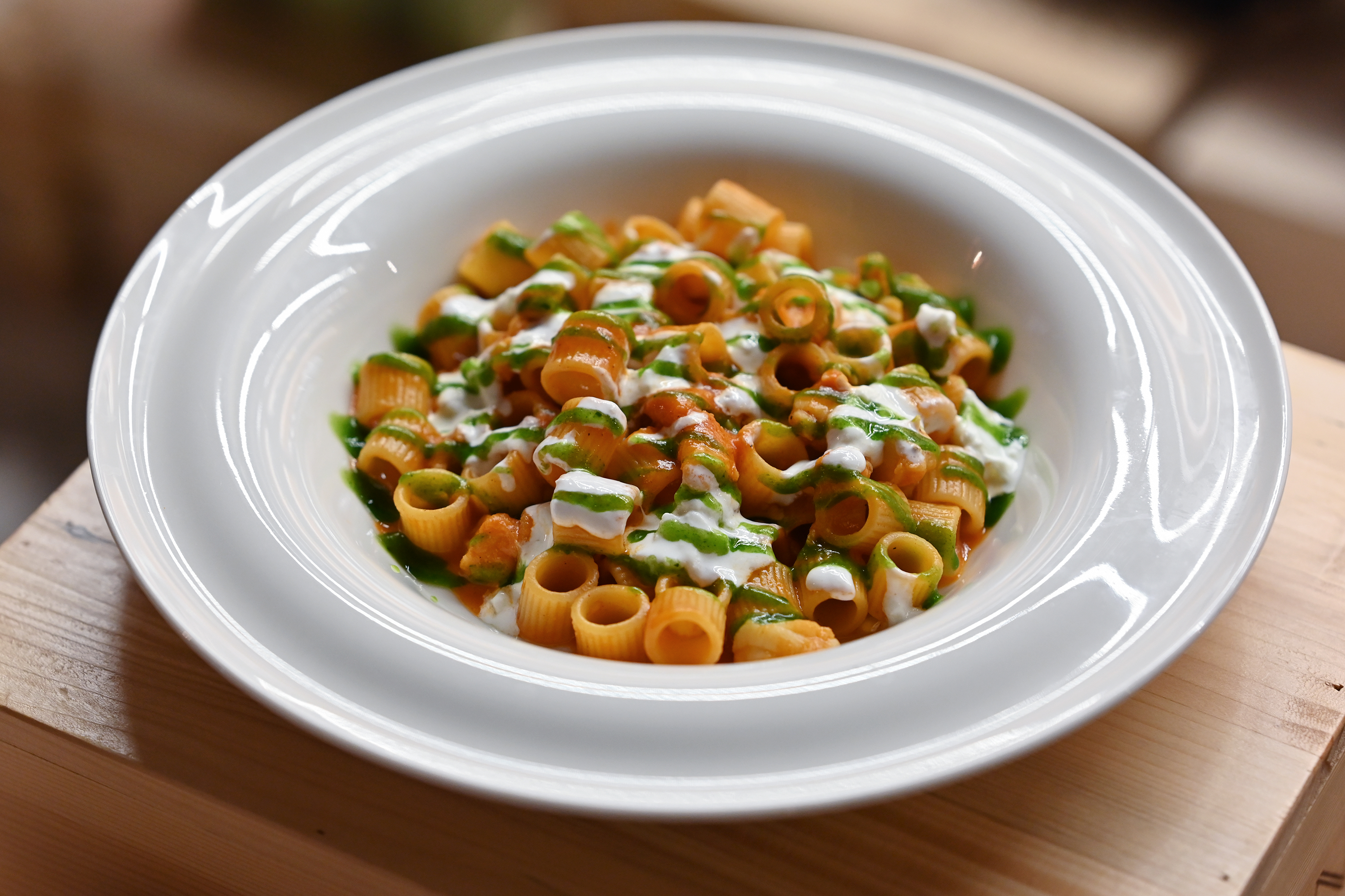 Tubettone con rana pescatrice, burrata e polvere di olive